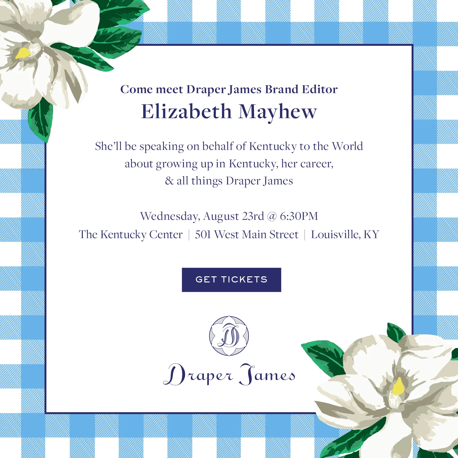 Join Kentucky to the World as style expert and Louisville native Elizabeth Mayhew, a regular on NBC's Today Show, a popular columnist for The Washington Post and currently the Brand Editor for Reese Witherspoon’s Southern-inspired brand, Draper James, shares how being Kentucky born and raised has helped propel her success in some unexpected and amazing directions. She will have a conversation with Shannon Cogan, multiple Emmy award winner and anchor for WAVE 3 News.